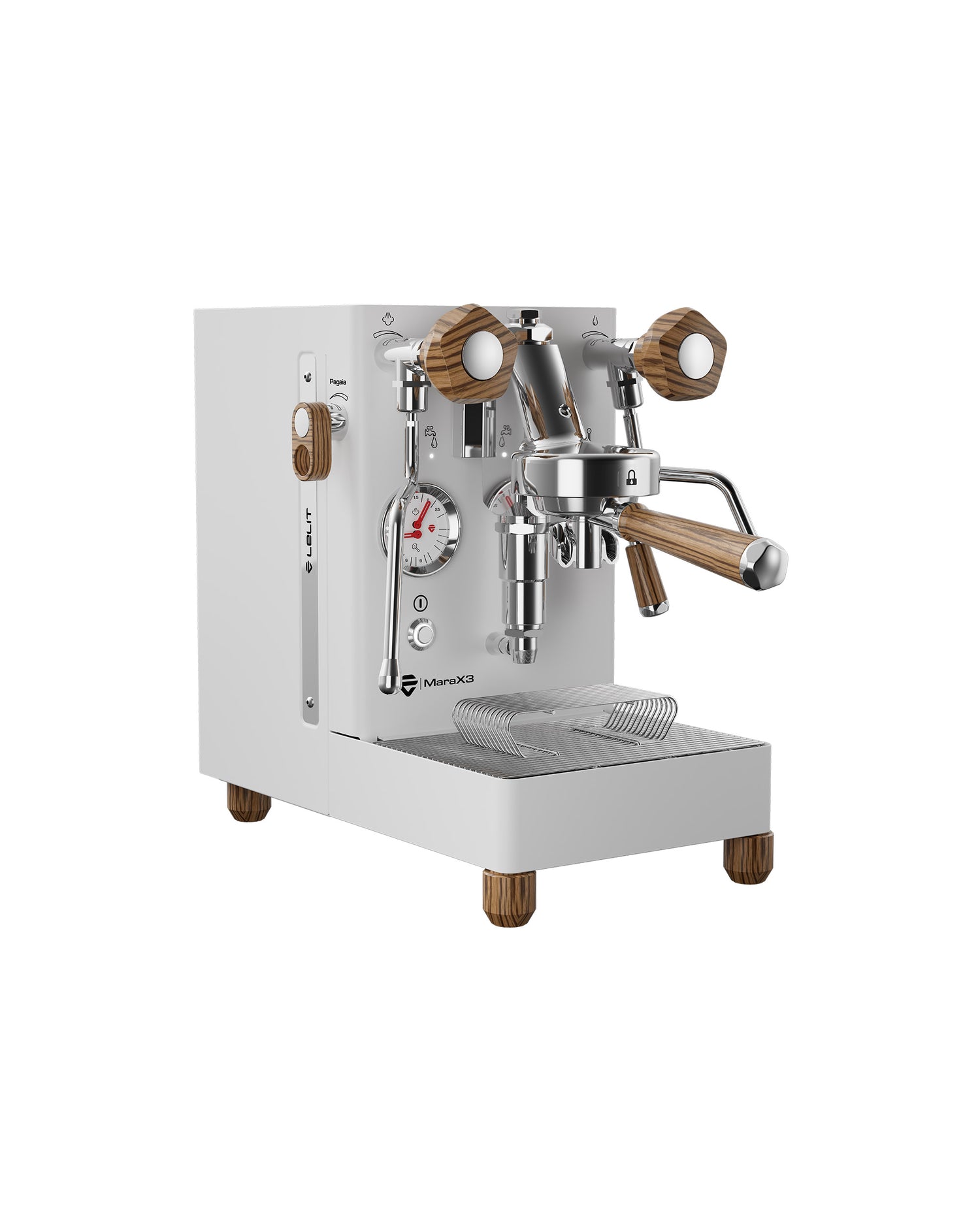 MaraX3 is also available in elegant white and black versions. Both maintain the new design language and the same technical features, ensuring identical performance in the cup. Completing the aesthetic, Zebrano wood details: Pagaia, knobs, lever, 2-way portafilter, and tamper, add a distinctive and refined tactile touch.